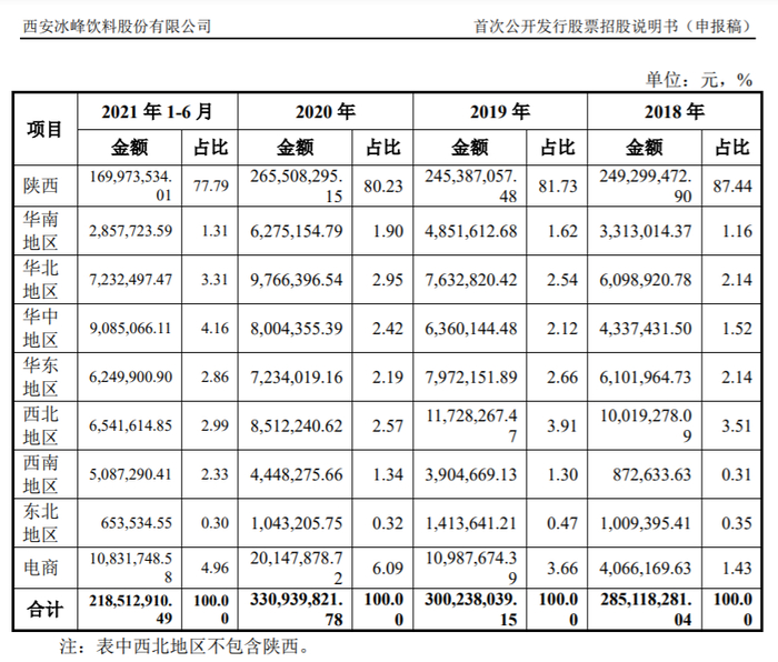 虽然品牌创立已尽80年,但冰封饮料的销售收入,却主要来自陕西地区,今年所占比超过八成。2018至2020年,该公司在陕西的销售额分别占比87.44%、81.73%、80.23%。