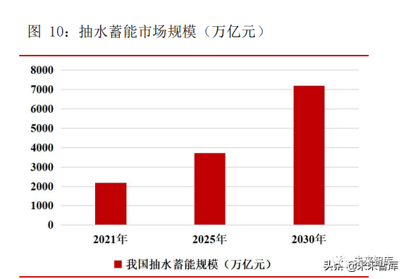2021年9月17日,国家能源局正式印发《抽水蓄能中长期发展规划(2021-2035年)》 (下称《抽蓄中长期规划》),并提出,按照能核尽核、能开尽开的原则,在规划重点 实施项目库内核准建设抽水蓄能电站。根据规划,到2025年,抽水蓄能投产总规模较“十 三五”翻一番,达到62GW以上,经测算,市场规模约3720万亿元;到2030年,抽水蓄能 投产总规模较“十四五”再翻一番,达到120GW左右,市场规模约7200万亿元。