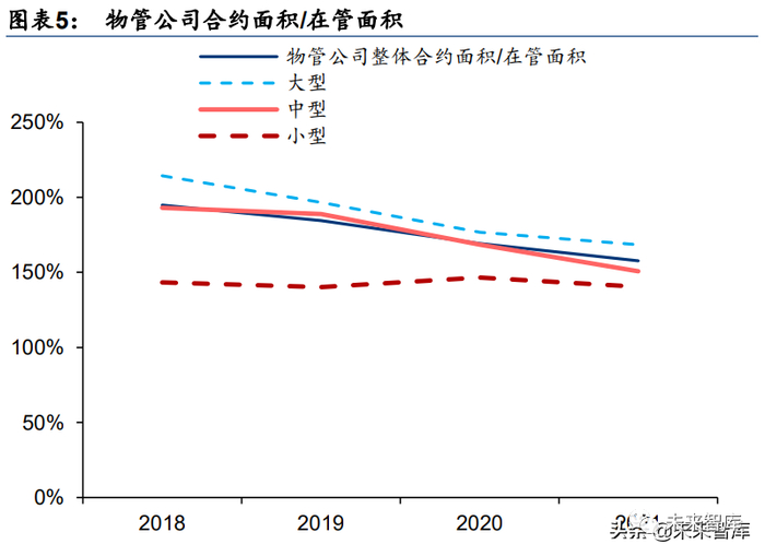 与在管面积类似,物管公司合约面积同比增速也出现回升,但依然低于在管面积同比增速, 导致合约面积/在管面积继续下行。从合约面积/在管面积来看,大型物管公司储备资源更加 充足,即便在管面积基数已经比较庞大,但仍拥有更高的增长能见度。