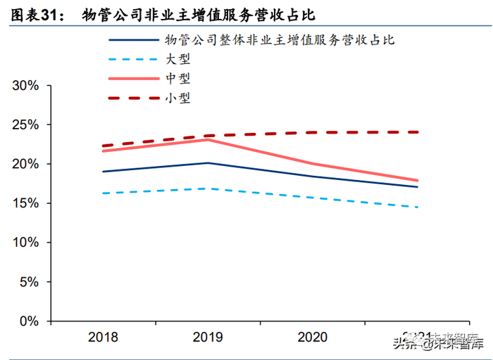 2021 年物管公司整体非住宅在管面积占比为 35%,同比+2pct。其中,大型、中型、小型 物管公司非住宅在管面积占比分别为 36%、31%、41%,同比-3、+7、+3pct。尽管部分公 司未将一些合同中没有明确面积的公建项目计入在管面积,物管公司整体非住宅在管面积 占比仍然取得提升,多元业态的发展思路仍是行业共识。