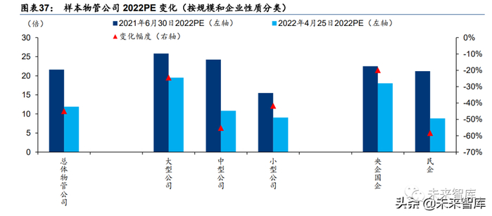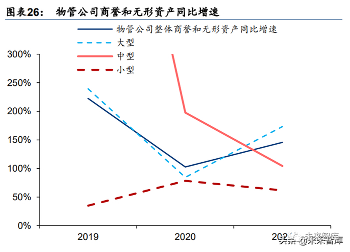 2021 年物管公司整体商誉和无形资产同比增长 145%,较 2020 年+42pct。其中,大型、 中型、小型物管公司商誉和无形资产同比增速分别为 173%、104%、59%,较 2020 年分 别分别+89、-94、-19pct。商誉和无形资产的快速增长主要来自收并购:一方面,评估师会 对收并购标的的合同及客户关系、品牌公允价值进行评估,形成逐年摊销的无形资产,摊 销成本会计入主营业务成本和管理费用;另一方面,收购溢价会形成商誉,不用摊销,但 每年需要进行减值测试。若收并购标的无法进行有效整合,未来业绩不达预期,商誉和无 形资产的减值可能会对物管公司利润造成负面影响。(报告来源:未来智库)