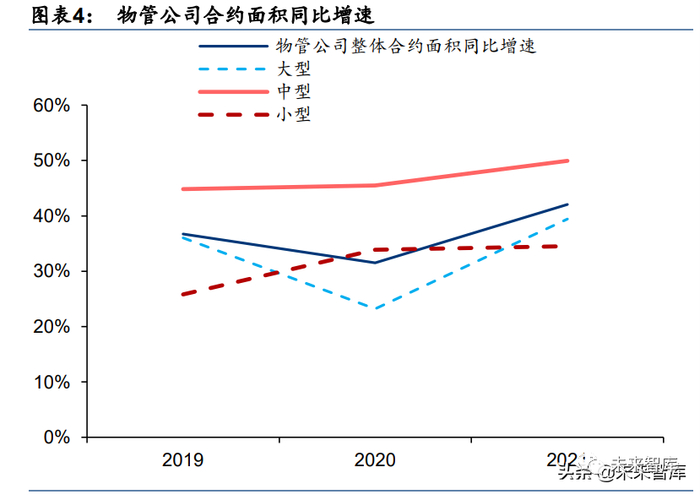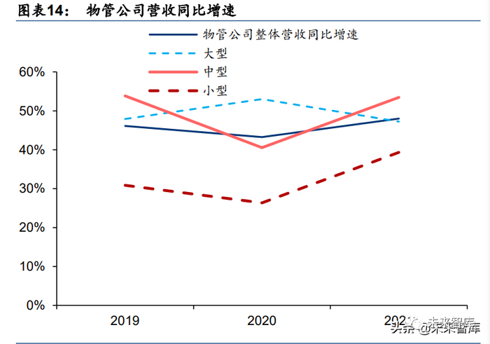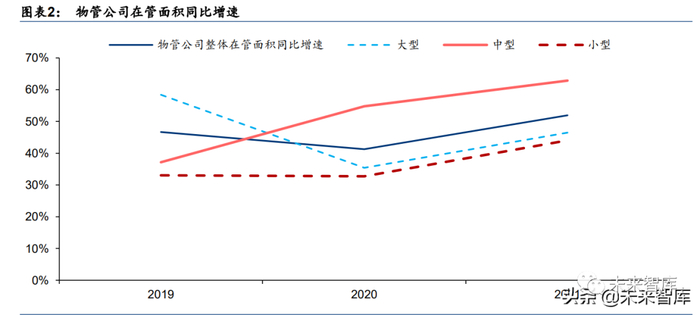 2021年物管公司整体在管面积达到 47.93 亿平,同比增长 52%,较 2020 年+11pct。其中, 大型、中型、小型物管公司在管面积分别同比增长 46%、63%、44%,较 2020 年+11、+8、 +11pct。