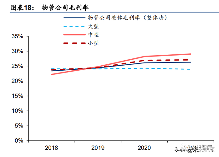 2021 年物管公司整体毛利率为 26.3%,同比+0.2pct。其中,大型、中型、小型物管公司毛 利率分别为 23.9%、29.0%、27.1%,同比分别-0.4、+0.8、+0.2pct。分业务来看,物管公 司整体基础物管服务、社区增值服务、非业主增值服务的毛利率分别为 21.1%、41.3%、 29.5%,同比分别-0.2、-2.3、-0.5pct。