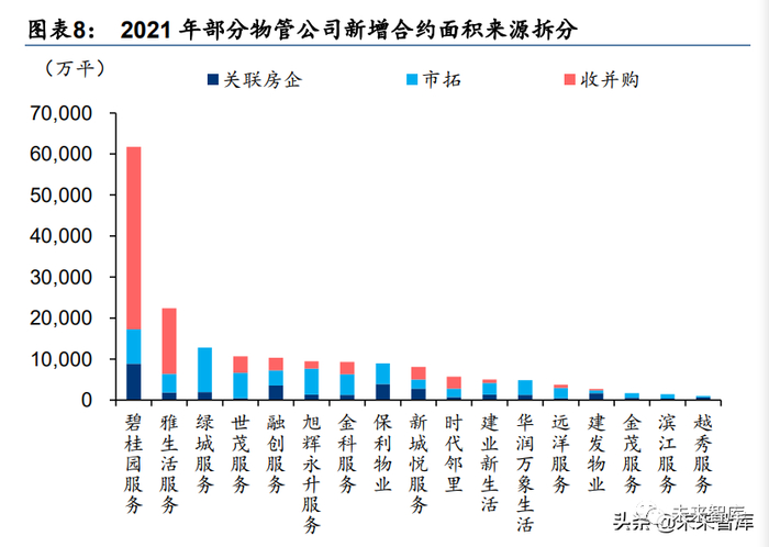 从市场化拓展绝对规模来看,绿城服务(10903 万平)、碧桂园服务(8396 万平)、世茂服 务(6332 万平)排名前三;从收并购绝对规模来看,碧桂园服务(44464 万平)、雅生活 服务(16010 万平)、世茂服务(4020 万平)排名前三;从关联房企支持规模来看,碧桂 园服务(8880 万平)、保利物业(3885 万平)、融创服务(3592 万平)排名前三。