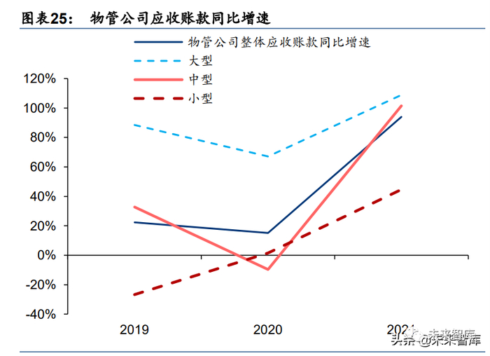 2021 年物管公司整体应收账款同比增长 94%,较 2020 年+79pct,也超越了营收增速。其 中,大型、中型、小型物管公司应收账款同比增速分别为 109%、101%、45%,较 2020 年分别+42、+111、+44pct。物管公司应收账款出现快速增长,除了业务规模扩张带来的自 然增长以外,还因为:1、收并购标的并表带入部分应收账款;2、部分公司在谈并购项目 产生的押金;3、城市服务业务存在更长的账期;4、部分房企资金流压力加大,导致付款 周期延长。应收账款快速增长使得计提坏账的风险加大,部分公司已采取行动,例如碧桂 园服务提出“三缴一流”计划,即追缴往期、收缴当期、预缴未来、加强综合现金流管控, 力争控制应收账款的规模。