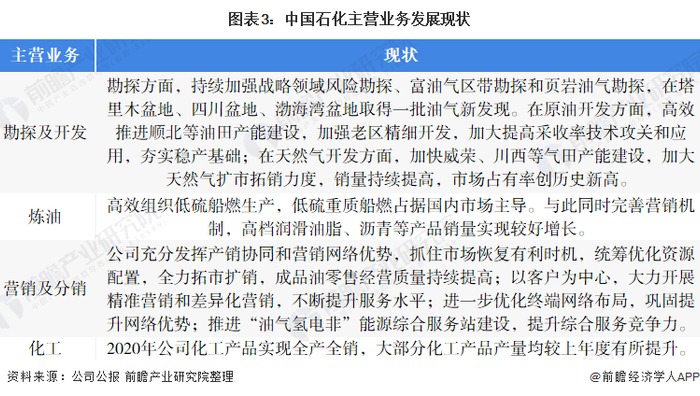 中国石化主营业务包括勘探及开发、炼油、营销及分销及化工四个板块,从2020年各大板块的现状来看,中国石化与加油站业务相关的营销及分销业务发展较好,发展重点主要集中于统筹优化资源配置,扩大销售范围及提高产品质量等。