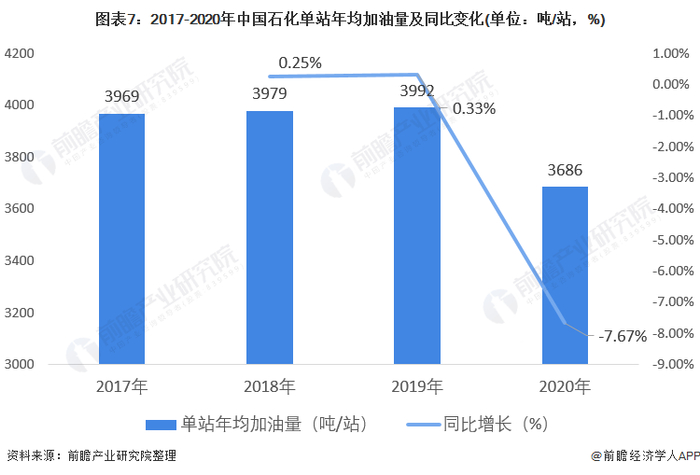 2017-2019年中国石化加油站单站年均加油量每年均保持小幅增长,2019年中国石化单站年均加油量为3992吨/站。2020年受新冠疫情影响,中国石化加油站数量及成品油销售均受到影响,导致单站年均加油量同比下降7.67%,降至3686吨/站。