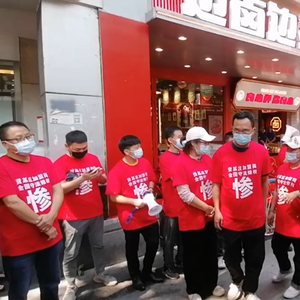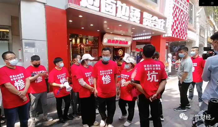 近期,贤合庄的多位加盟商来到成都贤合庄总店门口维权。这些人身穿统一样式的红色短袖,正面一个大大的“惨”字,背后一个大大的“坑”字,同时附有两行小字,“贤某庄加盟商 全国守法维权”。