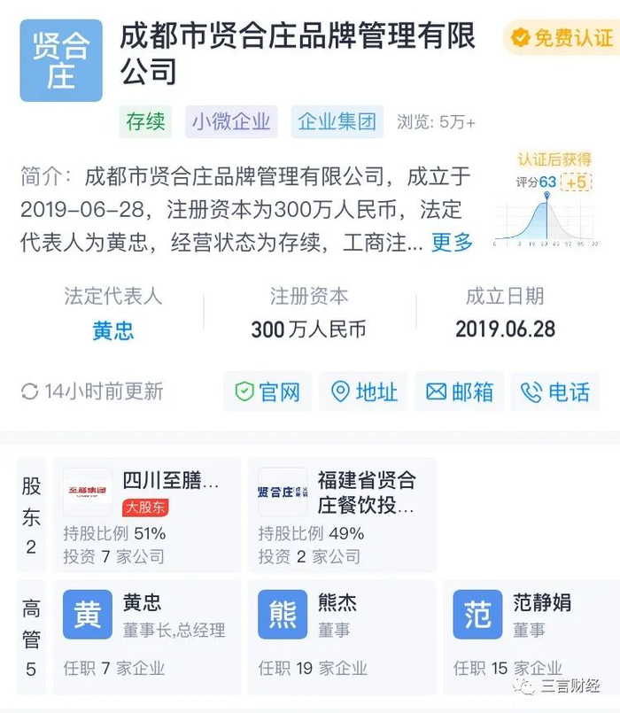 据了解,贤合庄的背后是成都市贤合庄品牌管理有限公司。