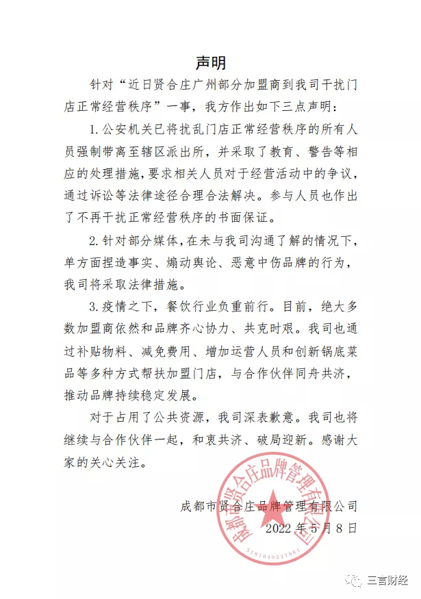 贤合庄加盟商维权的事情经过多日发酵,贤合庄官方在社交平台上发表声明做出回复,将此事定义为“部分加盟商到我司干扰正常经营秩序”。