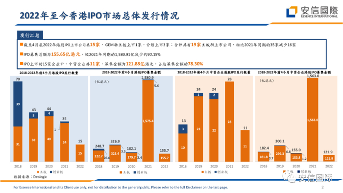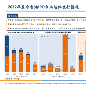 据安信国际统计,2022年1-4月港股IPO上市公司共19家,包括介绍上市3家与GEM转主板1家,相较2021年同期减少16家。IPO募资总额155.65亿港元,较2021年同期的1580.91亿港元减少90.15%。