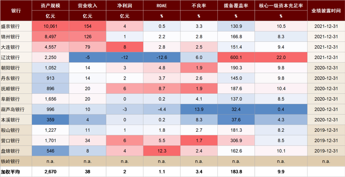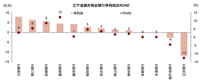 注:其中盛京银行、锦州银行、大连银行、辽沈银行采用2021年年度报告数据,朝阳银行、丹东银行、抚顺银行、阜新银行、葫芦岛银行、本溪银行采用2020年年度报告数据,鞍山银行、营口银行、盘锦银行采用2019年年度报告数据;盘锦银行未合并村镇银行数据