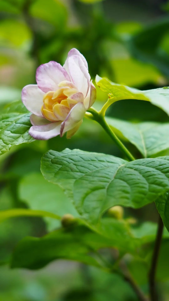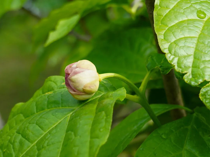 苍翠欲滴的绿叶泛着夏日的阳光,一盏盏白里透红的花儿从硕大的对生叶之间探出,外侧的白是淡抹的粉,边缘点缀浓妆的紫,如山茶般静谧,似玉兰般清纯,若莲花般空远。细看那明黄色的内轮裹着杏黄色的花药,露出蕊的芬芳。