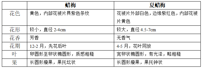 虽然同为一个属的植物,夏蜡梅在花形状、大小和颜色方面,与美国夏蜡梅和加州夏蜡梅的差别十分明显。夏蜡梅花较大,花被片内外两型明显,外被片呈倒卵状椭圆形或倒卵形,白色,边缘淡紫红色,内被片肉质,顶端内弯,黄白色至淡黄色,腹面基部具淡紫红色斑点;而美国夏蜡梅和加州夏蜡梅的花被片为紫红偏褐色,内外分型不明显,均呈线形或线状披针形;夏蜡梅花无香气,而美国夏蜡梅和加州夏蜡梅具有香甜的水果香气,英文名为sweetshrub/ strawberry-bush;它们花期接近,均在5月中下旬。