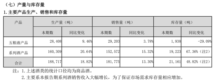 但反观五粮液营收占比达到20.4%的系列酒产品,生产量16万吨,同比增长20.64%;销售量达到15.3万吨,同比增长15.32%;库存量则达到1.9万吨,同比大增67.36%。仅从产销角度来看,五粮液的系列酒产品库存量大增近七成,且五粮液将大部分产能侧重在了系列酒产品上。