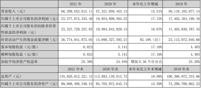 根据五粮液、泸州老窖和洋河股份2019年至2021年三年的年报数据,胜马财经整理计算,制成上表。