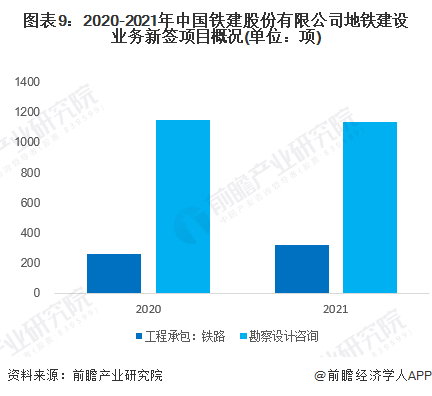 从地铁建设新签业务情况来看,2020-2021年中国铁建的铁路建设新签项目较为稳定,维持在每年新增1000项左右;2021年勘察设计项目新签项目数量增幅较大,说明公司经营可持续性较强。