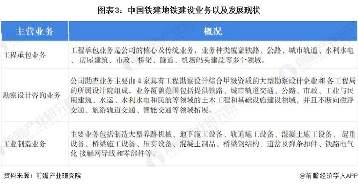 中国铁建的地铁建设业务除了工程承包业务之外,还延伸至地铁上游勘察设计咨询业务和建造工具制造业务,业务覆盖铁路、公路、城市轨道、水利水电、房屋建筑、市政、桥梁、隧道、机场码头建设等多个领域。