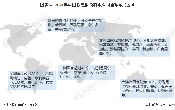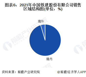 截至2021年,公司海外经营业务遍及世界138个国家和香港、澳门等地区,海外业务的发展稳定正常。中国铁建在海外的代表性业务有土耳其安伊高铁二期、安哥拉本格拉铁路、尼日利亚铁路现代化项目、阿尔及利亚东西高速公路等一大批在国际上具有重大影响力的标志性工程。目前公司的营收还是以国内为主,其中境内营业收入9730.44亿元,占总营业收入的95 %。