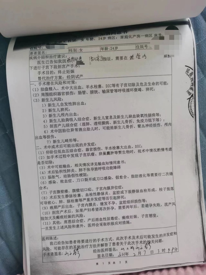 她告诉正观新闻记者,自己当时入院时办理的是家庭化产房,一张知情同意书上显示她所在病区为家庭化产房一病区。