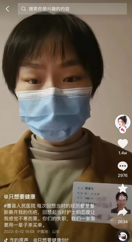 “今天是我第三次实名举报曹县人民医院”,5月12日,殷淑文再次在社交平台发布了一条视频,称其在曹县人民医院住院生孩子期间遭遇护士态度差、脐带脱垂未得到及时救治、病历做假等。