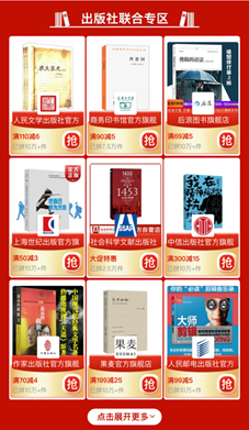 ▲ 第三季“多多读书月”活动设立出版社联合专区,人民文学出版社、商务印书馆、中信出版社等上百家国内主流出版社、图书出版公司官方旗舰店一键直通。
