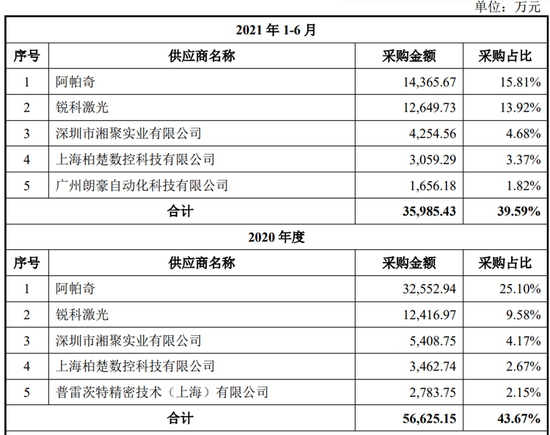 激光器做为激光加工行业价值最高的零部件,公司对外的采购金额更是连年扩大,报告期内,公司的激光器供应商阿帕奇和锐科激光也是公司最大的两家总供应商。