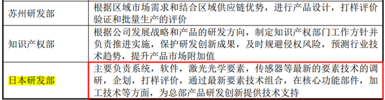 同时,公司又在招股书中提到有一家日本研发部,主要负责系统,软件,激光光学要素,传感器等最新的要素技术的调研,企划,打样评价,通过最新要素技术组合,在核心功能部件,加工技术等方面,为总部产品研发创新提供技术支持。