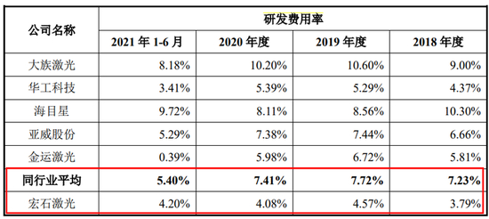 但是从研发投入来看,2018-2021年上半年,公司研发费用分别为3779.26万元、5549.49万元、7295.86万元、5119.21万元,占营收比重分别只有3.79%、4.57%、4.08%、4.20%。研发投入强度不仅远远低于大族激光,也落后于行业平均水平。公司的解释是自家“研发投入效率较高”。