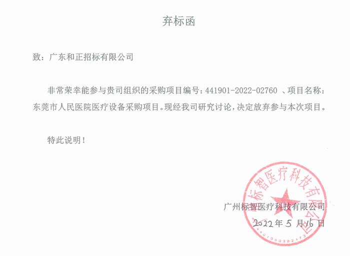 不过,在公布中标价格后不久,广州标智医疗科技有限公司就发布了弃标函称:“现经我司讨论,决定放弃参与本次项目。”