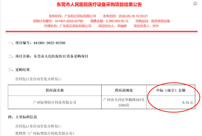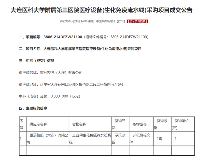 此次发生在东莞的中标情况的确不是国内首个IVD低价中标的公开案例。4月21日,中国政府采购网曾发布了大连医科大学附属第三医院医疗设备(生化免疫流水线)采购项目成交公告,中标(成交)金额为0.0001万元,也就是1块钱即中标。