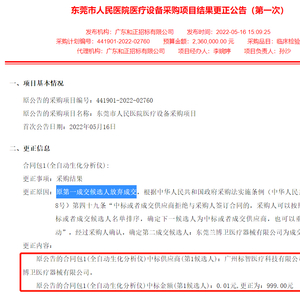 近期,中国政府采购网广东分网(广东省政府采购网)公布的“东莞市人民医院医疗设备采购项目结果更正公告”引发外界关注。