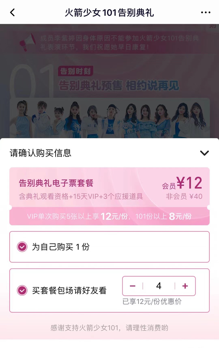 追溯至2020年,火箭少女解散演唱会就以非会员40元,会员18元,5份以上每份12元,101份以上每份8元的方式为平台拉新。