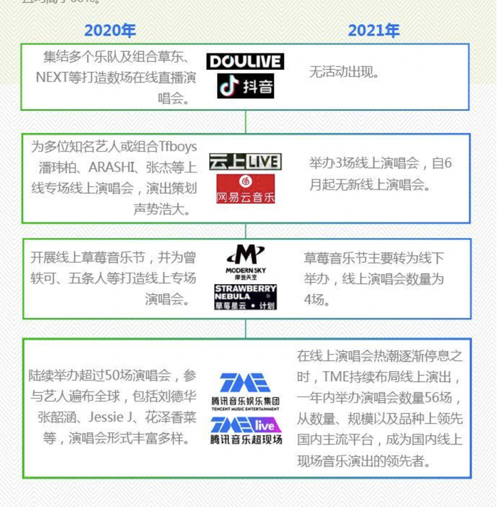 新京报贝壳财经记者梳理看到,腾讯、抖音、阿里以及网易接连进场,其中,腾讯推出TME live,整个2021年举办了56场现场表演。