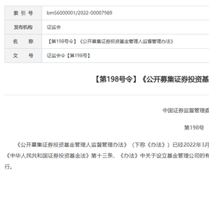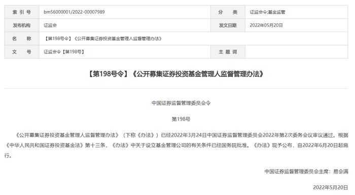 财联社5月20日讯(记者 黎旅嘉)于2004年首次发布的《证券投资基金管理公司管理办法》,在2012年进行小幅修订后,今年再次迎来修订,并更名为《公开募集证券投资基金管理人监督管理办法》。