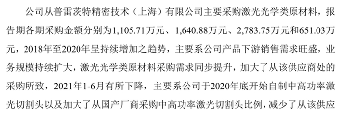 据披露,2018年至2020年及2021年上半年,宏石激光从普雷茨特精密技术(上海)有限公司采购激光切割头的金额分别为1105.71万元、1640.88万元、2783.75万元和651.03万元。