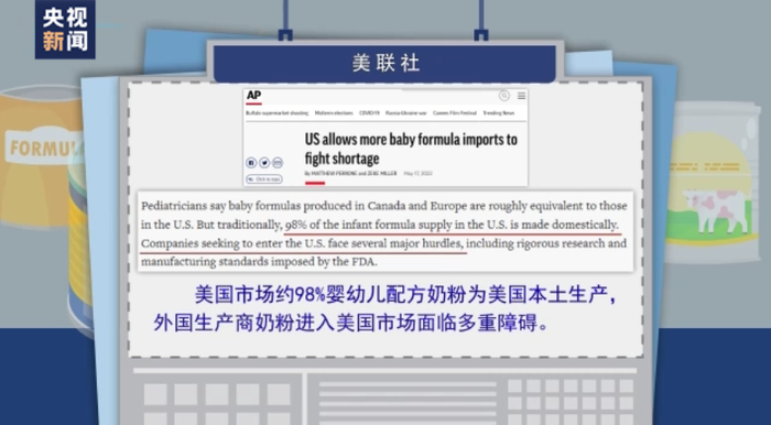 “奶粉荒”背后还有更深层次的原因。据美联社报道,美国市场约98%婴幼儿配方奶粉为美国本土生产,外国生产商奶粉进入美国市场面临多重障碍。《大西洋月刊》则在分析中提到,美国为维护本土品牌、严格控制配方奶粉进口而高筑关税壁垒,加剧了奶粉荒短时间难以缓解的局面。