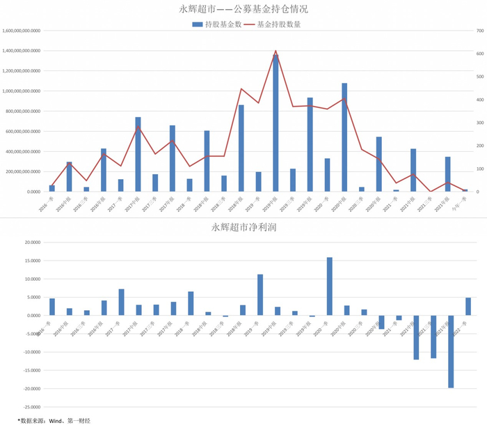2020年年底永辉超市估值已经回落至38倍,资本也在加速逃离永辉。数据显示,2020年末,持股永辉的公募基金有238家,2021年Q1锐减至8家,Q3甚至一家都不剩;公募基金持股比例也从3.43%一路下滑,截至2022年Q1仅为0.11%。曾非常看好永辉超市多次重仓的知名基金经理董承非也不讳言“看错了”,在2021年大幅抛售1.54亿股。