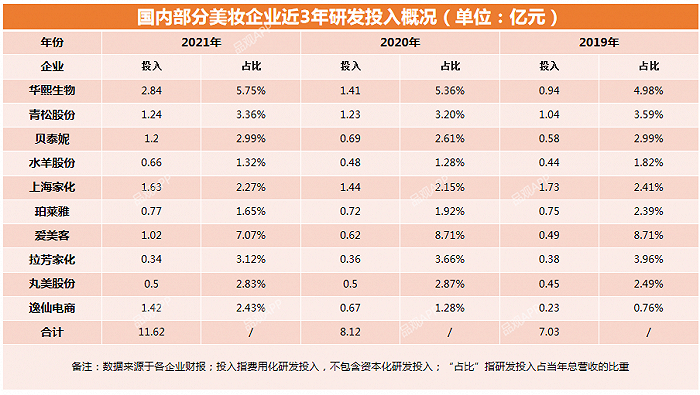 统计可知,2019年-2021年,上述10家美妆企业总研发投入分别为7.03亿、8.12亿和11.62亿。3年共投入26.77亿,累计增长65.29%。其中,2021年增速明显,同比增长43.1%。