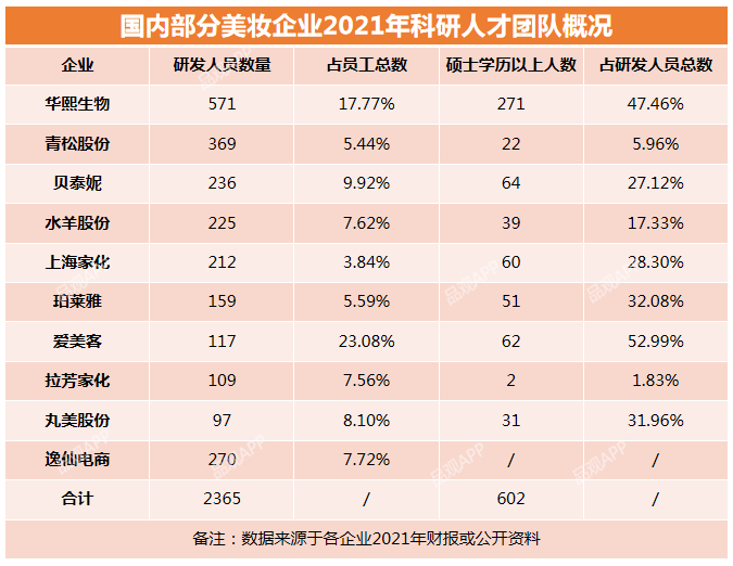 统计发现,2021年,仅上述10家企业就吸纳了2365名科研人才。华熙生物以571名科研人才,一家独占24%。且50%的科研人才,被华熙生物、青松股份和贝泰妮3家企业所拥有。