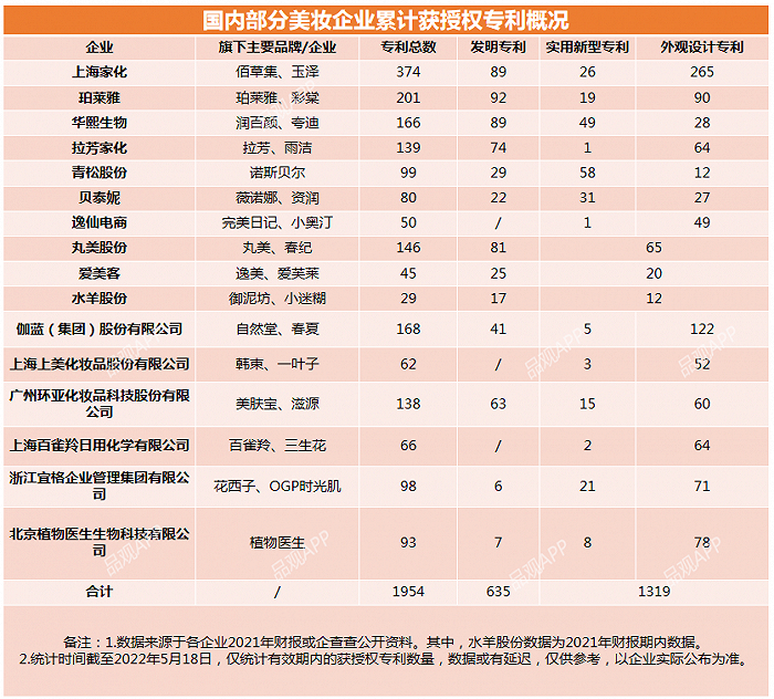 根据统计,上述16家美妆企业累计获授权专利总数超1954项。其中,上海家化、珀莱雅和伽蓝(集团)股份有限公司分别以374项、201项和168项专利夺得前3名,占总数的38%。