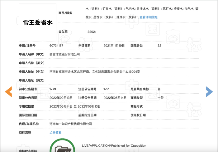 财经网产经讯 5月20日,财经网产经由中国商标网获悉,近日,蜜雪冰城股份有限公司申请的“雪王爱喝水”商标状态变更为已注册,该商标申请于2021年11月,国际分类为啤酒饮料。