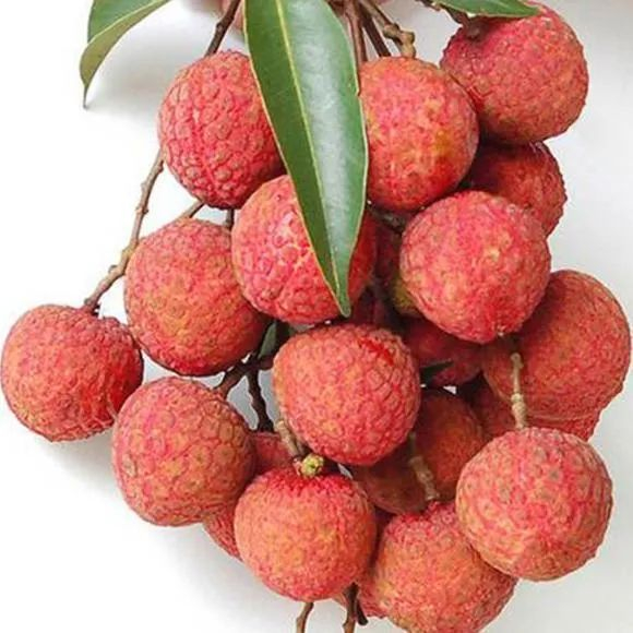 妃子笑又名落塘蒲、玉荷包,在茂名地区栽培历史悠久,主要分布在广东、广西等地区,该品种是中早熟优质品种之一。妃子笑具有粗生、易长、耐肥、喜水、枝粗叶大的特点。其花枝细小,果大,单果重28.0克至31.1克,近圆形或倒卵形,果形整齐美观,果顶浑圆或钝,果肩一边高,一边平阔,果梗粗直。果皮薄,色淡红,果肉厚,白腊色,清甜多汁,核小,于5月下旬成熟上市。果实在未转红前已经味甜可食,全红过熟品质下降。