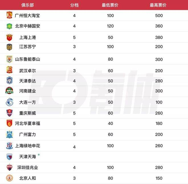看完上座人数,我们就可以来粗略计算一下中超的门票收入了——虽然比赛票价根据场次不同会有所浮动,但据调研显示,大部分中超球队的票价分档都在3到5档之间,最低单场票价平均在100元/张(包括)以下,最高票价则平均在200元/张到400元/张之间,该赛季中超的单场最高官方票价是广州恒大淘宝的500元/张。