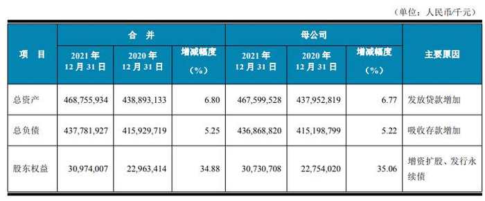 2021年末,汉口银行总资产4687.56亿元,比上年末增长6.80%;总负债4377.82亿元,比上年末增长5.25%。