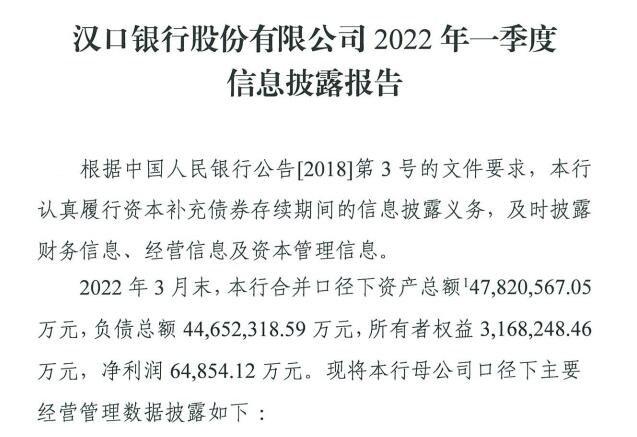 2022年3月末,汉口银行资本充足率11.91%,一级资本充足率10.06%,核心一级资金充足率8.43%。