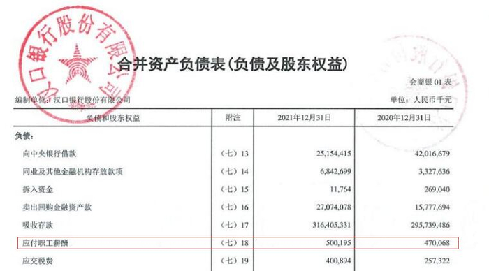 截至2021年末,汉口银行应付职工薪酬为5.00亿元,上年末为4.70亿元。