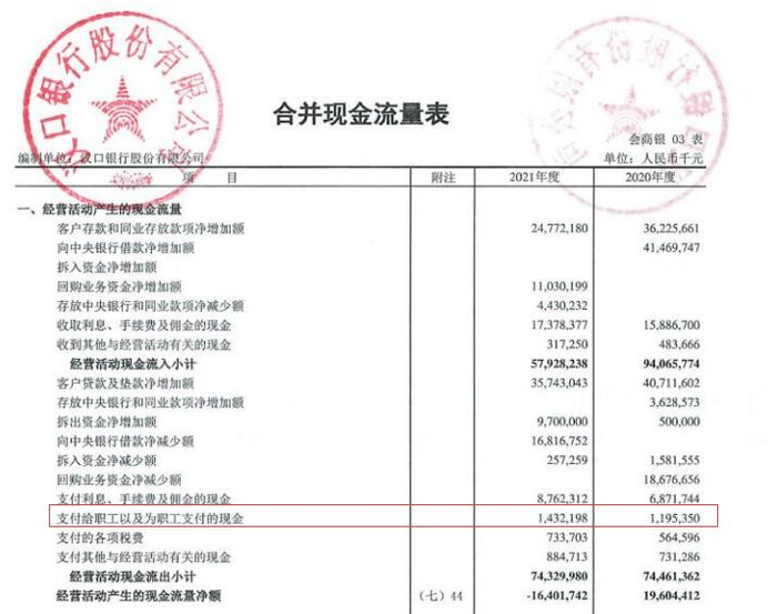 2021年,汉口银行支付给职工以及为职工支付的现金为14.32亿元,上年同期为11.95亿元。