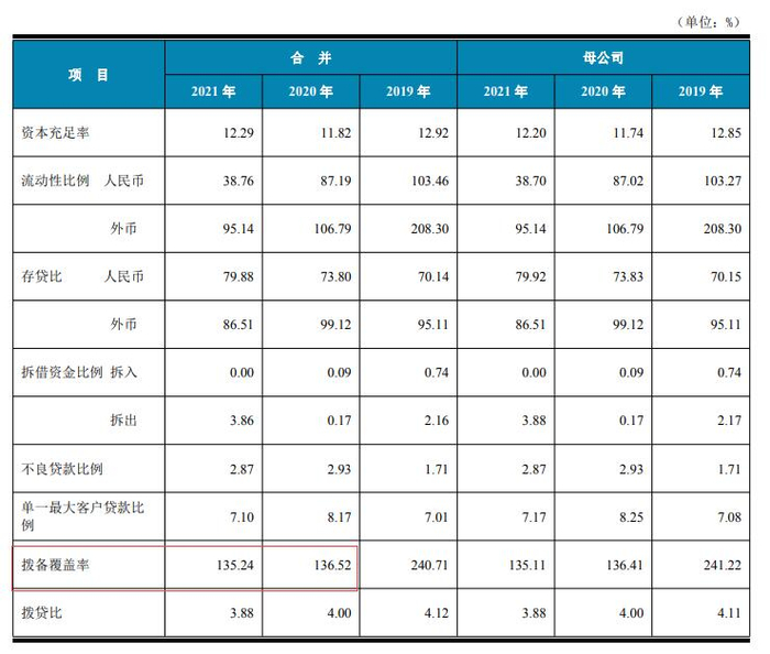 2021年末,汉口银行拨备覆盖率为135.24%,上年末为136.52%;资本充足率为12.29%,上年末为11.82%;一级资本充足率为10.47%,上年末为8.94%;核心一级资本充足率为8.70%,上年末为8.15%。