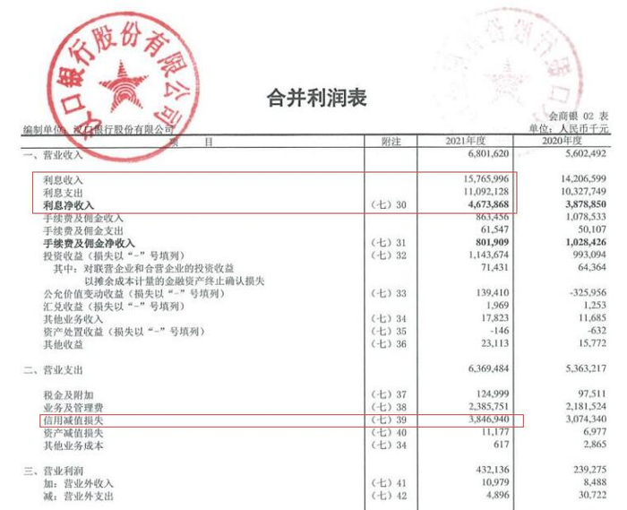2021年,汉口银行信用减值损失为38.47亿元,2020年为30.74亿元,同比增长25.15%。